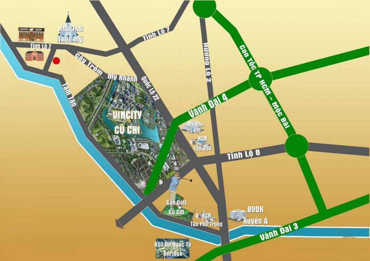 Vinhomes Củ Chi tọa lạc tại khu vực cửa ngõ Tây Bắc TP.HCM, trải dài trên địa bàn hai huyện Hóc Môn và Củ Chi. Vị trí này mang lại nhiều lợi thế chiến lược: